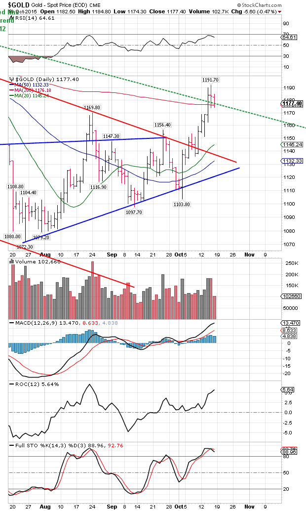 Just a word about those inflation markets, oil and copper. After breaking out of a pennant and trading up to its 200 DMA, WTIC traded down to its 20 day moving average, caught, and turned up today. That suggests but doesn't prove that the August low was THE low. Copper is still riding on a double bottom August/September. Floating up toward its 200 DMA.